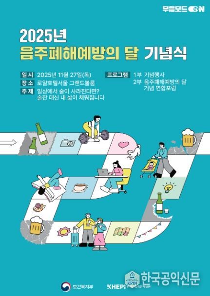 한국공익신문 관리자 기자 | 보건복지부와 한국건강증진개발원(원장 김헌주)은 11월 27일 오후 1시 30분부터 로얄호텔서울(서울 중구 소재) 그랜드볼룸에서 '2025년 음주폐해예방의 달 기념식'을 개최했다.