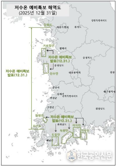 한국공익신문 관리자 기자 | 해양수산부는 12월 31일 15시부로 저수온 위기경보* ‘주의’ 단계를 발령했다고 밝혔다.