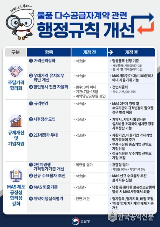 한국공익신문 관리자 기자 | 조달청은 조달 가격의 신뢰성을 높이고, 공공조달에 남아 있는 불합리한 규제를 혁파하기 위해 '물품 다수공급자계약 관련 행정규칙 2종'을 개정하여 2026년 1월 5일부터 시행했다고 밝혔다.