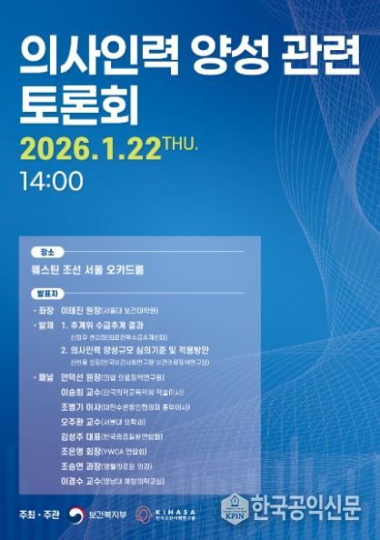한국공익신문 관리자 기자 | 보건복지부는 1월 22일 오후 2시 웨스틴 조선 서울(서울 중구 소재)에서 2027학년도 이후 의사인력 양성규모 결정과 관련하여 폭넓은 의견수렴을 위해'의사인력 양성 관련 토론회'를 개최했다.