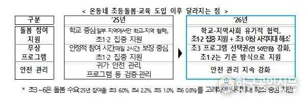 교육부는 2024년부터 늘봄학교 정책을 통해 초등학교 1‧2학년의 돌봄 공백 해소를 집중적으로 지원해 왔다. 2026년부터는 기존의 늘봄학교를 ‘온동네 초등돌봄‧교육’ 정책으로 발전시켜, ①학교와 지역사회가 함께 희망하는 초등학생에게 사각지대 없는 돌봄을 제공하고, ②돌봄보다 교육에 대한 수요가 큰 초등학교 3학년 이상 학생*의 방과후 교육 참여를 중점 지원한다.