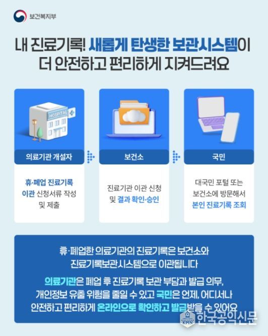 한국공익신문 관리자 기자 | 보건복지부와 한국보건의료정보원은 다니던 병원이 문을 닫아도 국민이 자신의 진료기록을 보다 편하게 확인할 수 있도록 휴·폐업 의료기관 진료기록보관시스템 개선을 추진한다고 밝혔다.