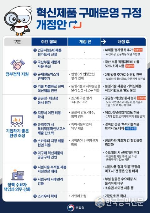 주요 개정 내용은 AI 제품에 대한 별도 혁신제품 평가 기준을 신설한다. AI 제품의 신뢰성, AI 모델의 적합성 등의 평가 항목을 마련해 더 많은 AI 제품이 혁신제품으로 지정될 수 있게 한다.
