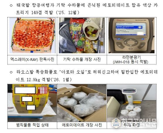 최근 관세청은 태국발 항공여행자의 기탁수하물에서 에토미데이트 성분이 함유된 액상 카트리지 149점을 적발했고, 라오스발 특송화물에서도 아로마오일로 위장한 에토미데이트를 잇따라 적발했다고 밝혔다.