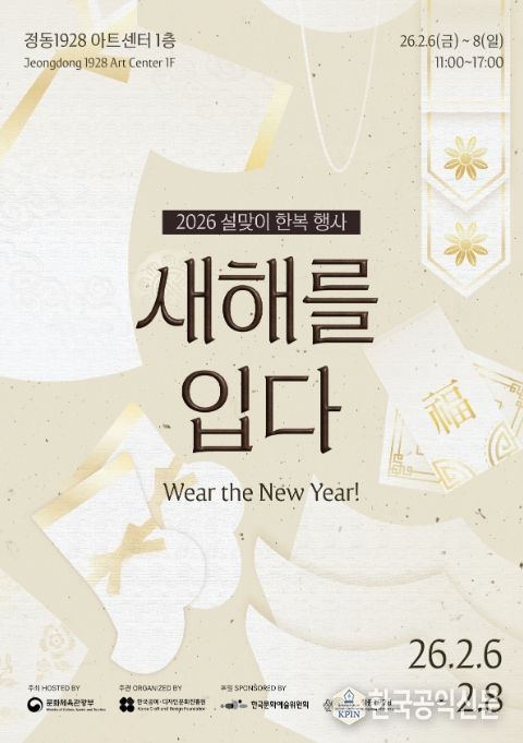 한국공익신문 관리자 기자 | 문화체육관광부는 한국공예·디자인문화진흥원과 함께 2026년 설을 맞이해 2월 6일부터 8일까지 정동1928 아트센터(서울 중구)에서 한복 문화 확산 캠페인 ‘새해를 입다’를 개최한다. 이번 캠페인은 민족 최대의 명절인 설을 맞이해 우리 고유의 의복인 한복의 가치를 되새기고, 일상에서 한복을 즐기는 문화를 널리 알리기 위해 기획한 행사다.