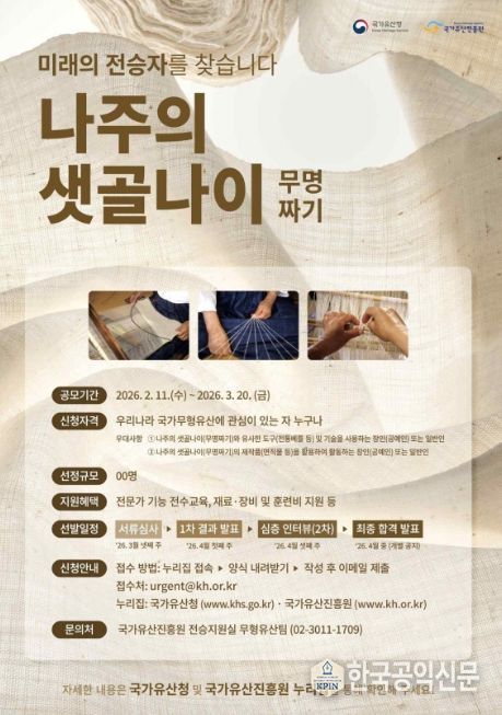 한국공익신문 관리자 기자 | 국가유산청은 국가유산청 산하 국가유산진흥원과 2월 11일부터 3월 20일까지 단절 위기의 국가긴급보호무형유산인 '나주의 샛골나이(무명짜기)'의 미래 전승자 발굴을 위한 공모를 진행한다.