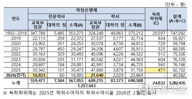 독학학위제(1990년~) 및 학점은행제(1997년~)가 시작된 이후, 2026년 2월 기준 누적 학위 취득자는 총 128만여 명(학점은행제 1,257,643명, 독학학위제 24,832명)에 이른다. 이는 우리 사회 전반에 평생학습 기반이 지속적으로 확대되어 왔음을 보여준다.