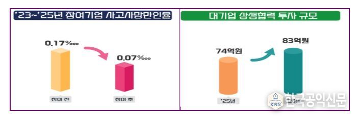 대기업과 정부의 지원을 받은 사업장은 안전한 일터로 거듭나고 있다. 지난 3년간 사업에 참여한 기업 10,453곳의 평균 사고사망만인율은 0.07‱로 참여 이전(0.17‱)보다 절반 이하로 감소했다.