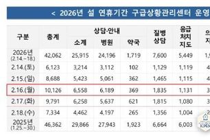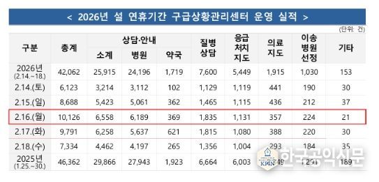 한국공익신문 관리자 기자 | 소방청은 2026년 설 연휴 기간(2.14.~2.18., 5일간)전국 총 45,082건의 구급 출동으로 24,166명을 이송하였으며, 구급상황관리센터에서 총 42,062건의 상담을 실시했다고 밝혔다.