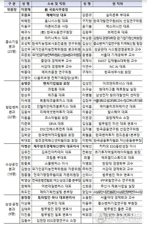 민관 정책협의회는 기업인, 민간 전문가, 학계, VC, 협·단체 등 총 72명의 위원으로 구성되어 출범일로부터 1년간 활동하게 된다. 또한 한성숙 중기부 장관과 이광재 전 국회사무총장이 공동위원장을 맡아 민관 정책협의회를 이끌어갈 예정이다.