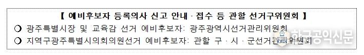 한국공익신문 관리자 기자 | 중앙선관위는 3월 5일 '전남광주통합특별시 설치를 위한 특별법'이 공포됨에 따라, 전남, 광주의 시·도지사(교육감 포함) 및 지역구시·도의회의원 선거의 예비후보자가 그 신분을 유지하려면 3월 16일까지 예비후보자 등록의사를 관할 선거구위원회에 서면으로 신고해야 한다고 밝혔다.