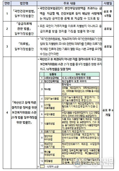 한국공익신문 관리자 기자 | 보건복지부는 3월 12일 제433회 국회(임시회) 본회의에서 '국민건강보험법'·'응급의료에 관한 법률'·'의료법' 일부개정법률안, '파산선고 등에 따른 결격조항 정비를 위한 보건복지위원회 소관 21개 법률 일부개정을 위한 법률안' 등 보건복지부 소관 4개 법률안이 의결됐다고 밝혔다.