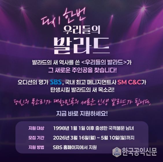 제작진은 “지난해 많은 관심과 사랑 덕분에 ‘우리들의 발라드’가 다시 한 번 새로운 주인공을 찾고자 한다”며 “누구나 대한민국의 새로운 인생 발라드를 부를 수 있다. 자신만의 감성을 가진 예비 발라더들의 많은 참여를 기다린다”고 전했다. 이번 참가자 공개 모집과 관련한 사항은 SBS ‘우리들의 발라드’ 홈페이지 및 ‘SBS NOW’ 인스타그램 등 디지털 계정을 통해 확인할 수 있다.